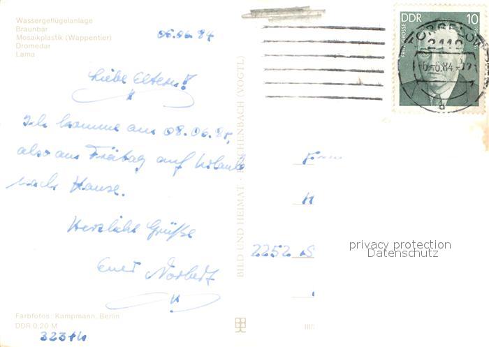 73640207 alte Postkarte Ueckermuende Mecklenburg Vorpommern Tierpark Wassergefluegelanlage Braunbaer Mosaikplastik Wappentier Dromedar Lama postalisch gelaufen Erhaltung siehe scans [FriedD77] KatCode: 11110013062059