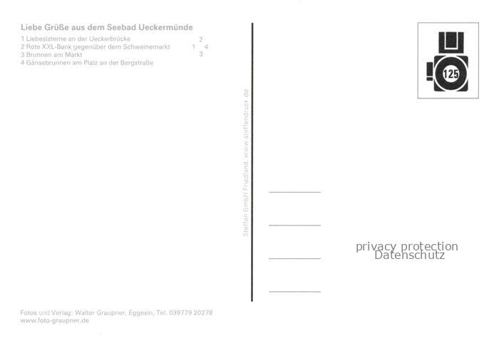 74021343 Ueckermuende ueckermuende Mecklenburg Vorpommern Liebeslaterne Ueckerbruecke Rote XXL-Bank Brunnen Markt Gaensebrunnen Platz an der Bergstrasse postalisch nicht gelaufen Erhaltung siehe scans [FriedD77] KatCode: 11110013062059