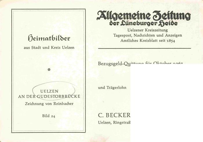 74014769 Uelzen Lueneburger Heide Hannover An der Gudestorbruecke Zeichnung Bezugsgeld Quittung postalisch nicht gelaufen Erhaltung siehe scans [WerneD78] KatCode: 11110003360025