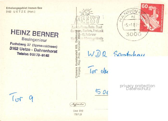 73648228 alte Postkarte Uetze Erholungsgebiet Irenen-See Campingplatz postalisch gelaufen Erhaltung siehe scans [FriedD77] KatCode: 11110003241018
