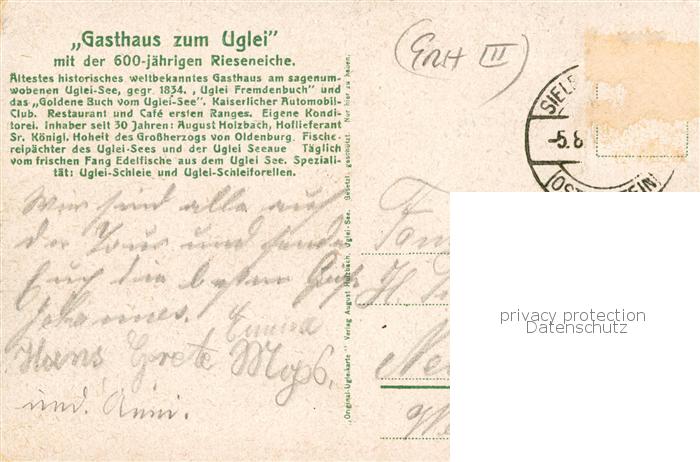 73807152 alte Postkarte Uglei See Eutin Gasthaus zum Uglei mit der 600jaehrigen Rieseneiche postalisch gelaufen Erhaltung siehe scans [WerneD78] KatCode: 11110001055041