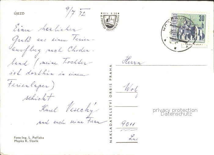 old postcard Ujezd u Domazlic Denkmal Tracht Wohnhaus innen postalisch gelaufen Erhaltung siehe scans