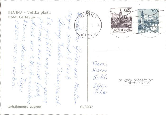 old postcard Ulcinj Velika plaza Hotel Bellevue postalisch gelaufen Erhaltung siehe scans
