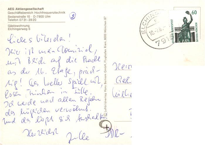 73945269 alte Postkarte Ulm Donau AEG Hochhaeuser Gaestewohnung Elchingerweg postalisch gelaufen Fliegeraufnahme Erhaltung siehe scans [WerneD78] KatCode: 11110008421000