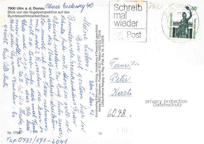 74050058 alte Postkarte ULM Donau Bundeswehrkrankenhaus Fliegeraufnahme postalisch gelaufen Erhaltung siehe scans [WerneD78] KatCode: 11110008421000