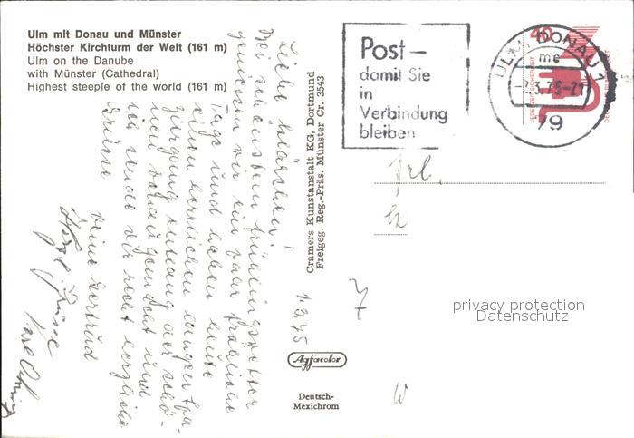 72375047 alte Postkarte Ulm Donau Fliegeraufnahme mit Donau und Muenster postalisch gelaufen Erhaltung siehe scans KatCode: 11110008421000