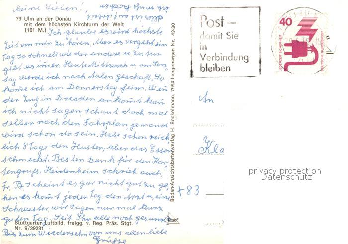 73173139 alte Postkarte Ulm Donau Fliegeraufnahme mit hoechstem Kirchturm der Welt postalisch gelaufen Erhaltung siehe scans [LiesaD40] KatCode: 11110008421000