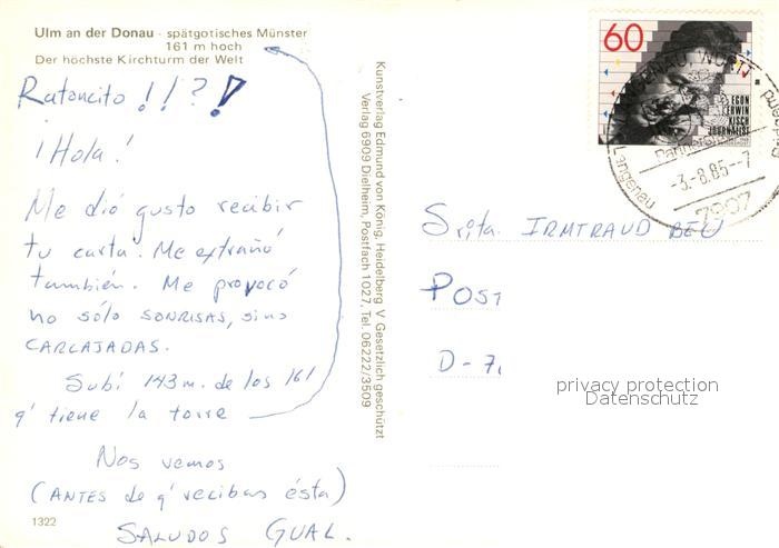 73541880 alte Postkarte Ulm Donau Fliegeraufnahme mit M?nster postalisch gelaufen Erhaltung siehe scans [LiesaD40] KatCode: 11110008421000