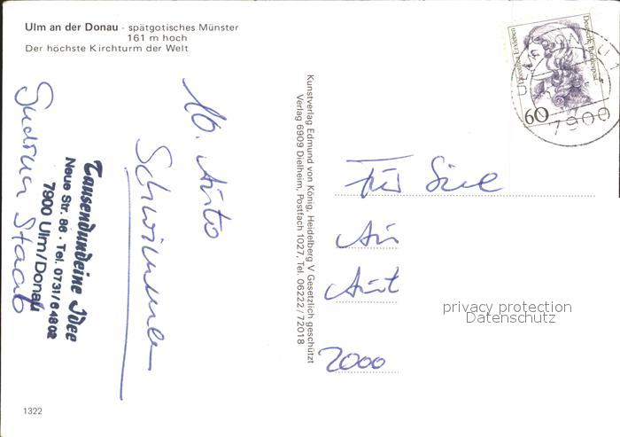 72063259 alte Postkarte Ulm Donau Fliegeraufnahme Muenster hoechster Kirchturm der Welt postalisch gelaufen Erhaltung siehe scans KatCode: 11110008421000