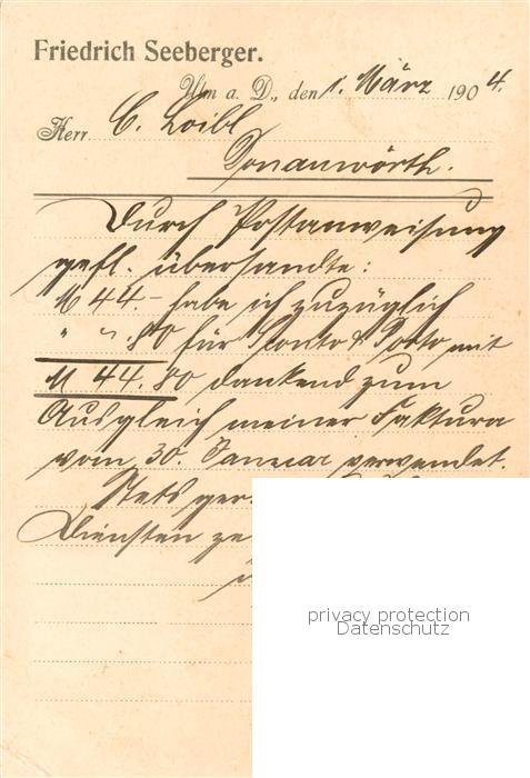 73780234 alte Postkarte Ulm Donau Friedrich Seeberger Antwortkarte postalisch gelaufen Erhaltung siehe scans [WerneD78] KatCode: 11110008421000