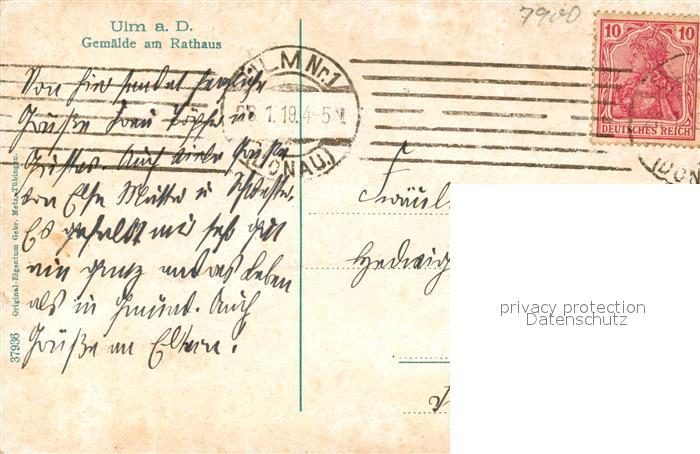 43489737 alte Postkarte Ulm Donau Gem?lde am Rathaus postalisch gelaufen Erhaltung siehe scans [LiesaD40] KatCode: 11110008421000