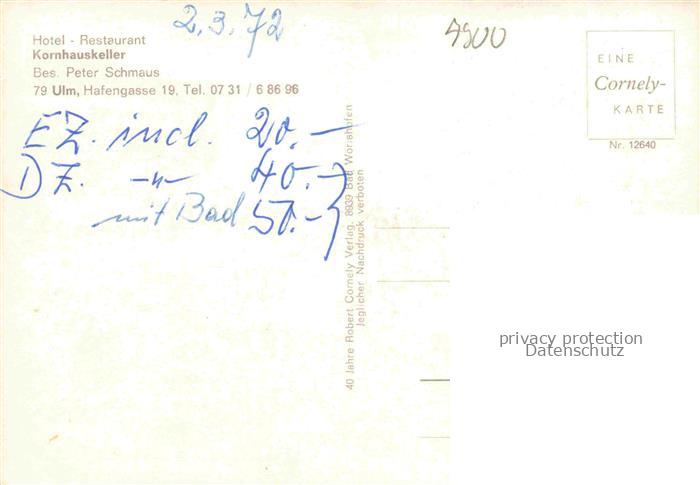 74050033 ULM Donau Hotel Kornhauskeller Restaurant postalisch nicht gelaufen Erhaltung siehe scans [WerneD78] KatCode: 11110008421000