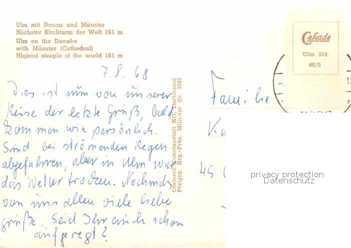 72884672 alte Postkarte Ulm Donau mit Muenster Fliegeraufnahme postalisch gelaufen Erhaltung siehe scans [WerneD78] KatCode: 11110008421000