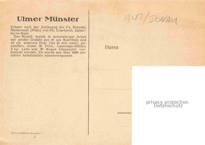 74092043 ULM Donau Modell Ulmer Muenster erbaut 1933 nach der Zeichnung Fa. Brendel Mutterstadt von Ph. Eberhardt Ueberherrn-Saar postalisch nicht gelaufen Erhaltung siehe scans [FriedD77] KatCode: 11110008421000