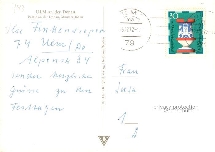 73124709 alte Postkarte Ulm Donau Partie an der Donau Blick zur Altstadt Muenster postalisch gelaufen Erhaltung siehe scans [FriedD77] KatCode: 11110008421000