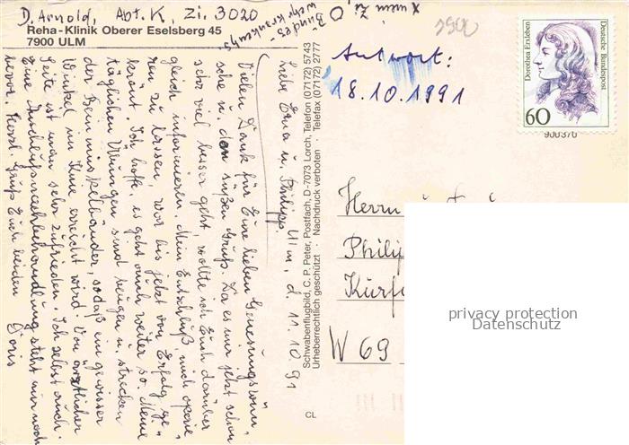 74050034 alte Postkarte ULM Donau Reha Klinik Fliegeraufnahme postalisch gelaufen Erhaltung siehe scans [WerneD78] KatCode: 11110008421000