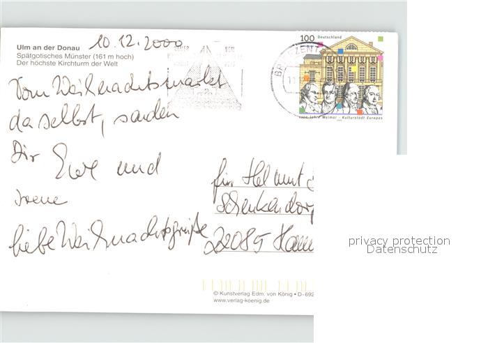 71850828 alte Postkarte Ulm Donau Spaetgotisches Muenster Hoechste Kirchturm der Welt Fliegeraufnahme postalisch gelaufen Erhaltung siehe scans KatCode: 11110008421000