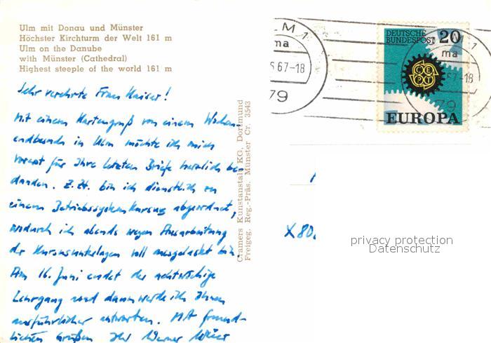 72833488 alte Postkarte Ulm Donau Stadtpanorama mit Muenster und Donau Fliegeraufnahme postalisch gelaufen Erhaltung siehe scans [FriedD77] KatCode: 11110008421000