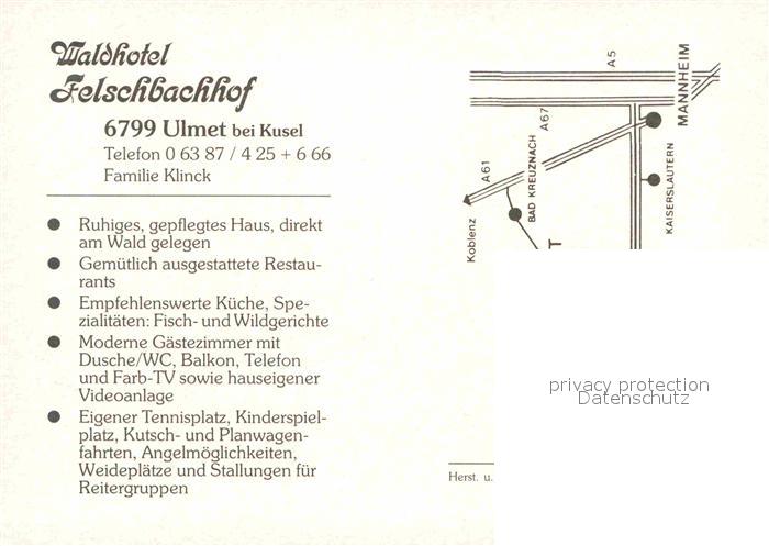 72777858 Ulmet Waldhotel Felschbachhof postalisch nicht gelaufen Werbekarte (keine Postkarte) Erhaltung siehe scans [LiesaD40] KatCode: 11110007336099