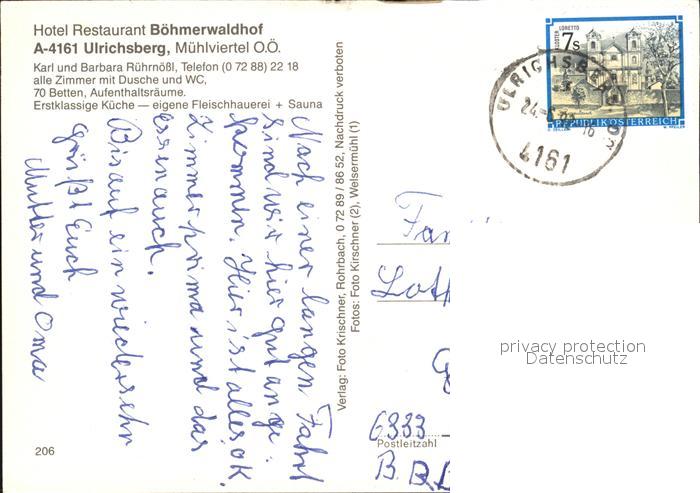 72498755 alte Postkarte Ulrichsberg Oberoesterreich Hotel Boehmerwaldhof Gaststube Panorama postalisch gelaufen Erhaltung siehe scans KatCode: 11390313041342