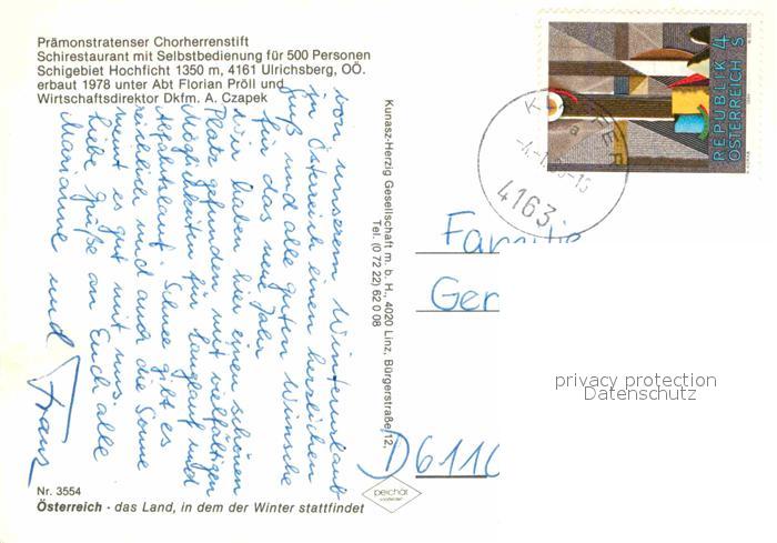 72797115 alte Postkarte Ulrichsberg Oberoesterreich Skigebiet Hochficht postalisch gelaufen Erhaltung siehe scans [LiesaD40] KatCode: 11390313041342
