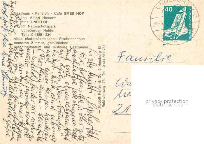 73725945 alte Postkarte Undeloh Gasthaus Pension Cafe Smes Hof Gastraum Heidelandschaft postalisch gelaufen Erhaltung siehe scans [FriedD77] KatCode: 11110003353036
