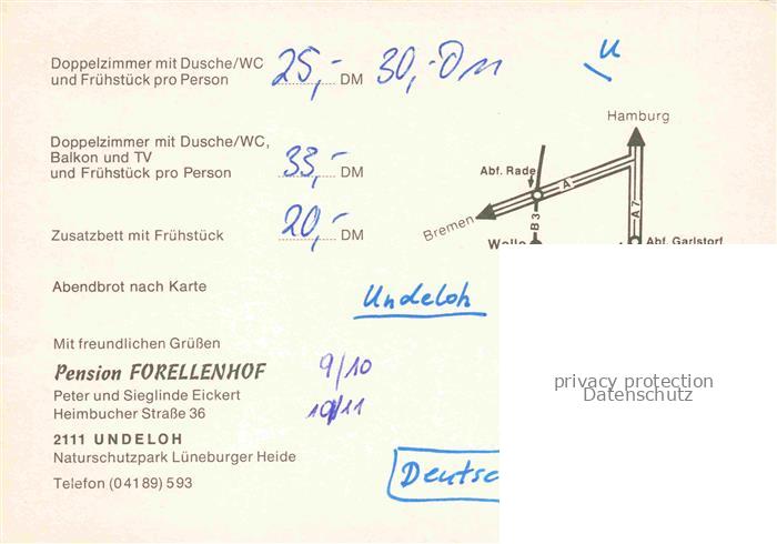 74043585 Undeloh Pension Forellenhof Landschaftspanorama Lueneburger Heide postalisch nicht gelaufen Werbekarte (keine Postkarte) Erhaltung siehe scans [FriedD77] KatCode: 11110003353036