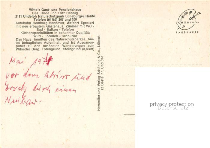73651169 Undeloh Witte’s Gast- und Pensionshaus Naturschutzpark Lueneburger Heide postalisch nicht gelaufen Erhaltung siehe scans [FriedD77] KatCode: 11110003353036