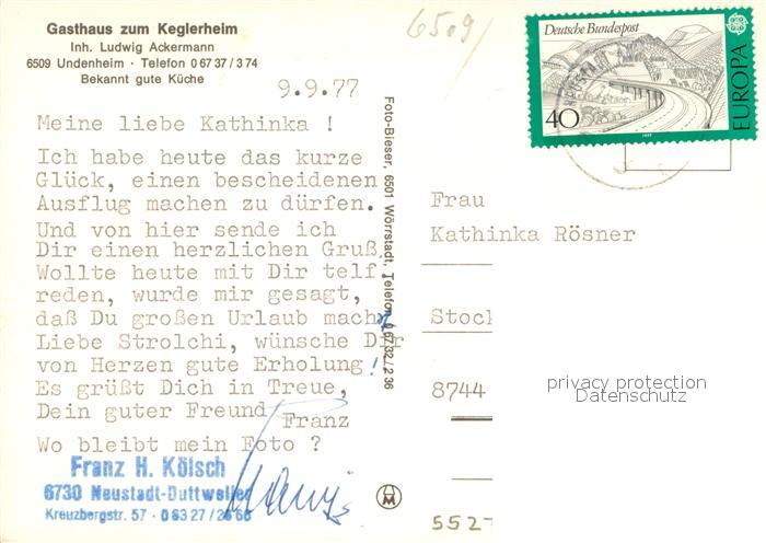 73642955 alte Postkarte Undenheim Gasthaus zum Keglerheim Restaurant Kegelbahn postalisch gelaufen Erhaltung siehe scans [FriedD77] KatCode: 11110007339060