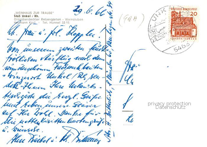 74052323 alte Postkarte Unkel Rhein Gasthof Zur Traube Rosengarten Weinstuben postalisch gelaufen Erhaltung siehe scans [WerneD78] KatCode: 11110007138073