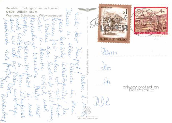 72699921 alte Postkarte Unken Alpenbad Freizeitzentrum Saalach Alpenpanorama Fliegeraufnahme postalisch gelaufen Erhaltung siehe scans [FriedD77] KatCode: 11390322050623