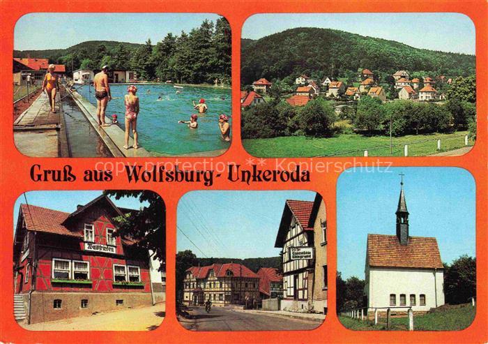 Unkeroda Eisenach Thueringen Schwimmbad Teilansicht Gaststaette Waldfrieden Hauptstrasse Kirche postalisch nicht gelaufen Erhaltung siehe scans [WerneD78] Wern Katcode 11110016056000