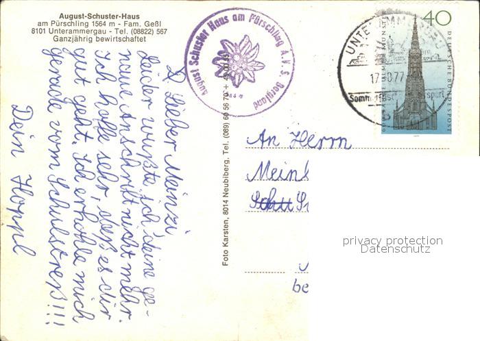 72590692 alte Postkarte Unterammergau August Schuster Haus am Puerschling Fliegeraufnahme postalisch gelaufen Erhaltung siehe scans [WerneD78] KatCode: 11110009180135