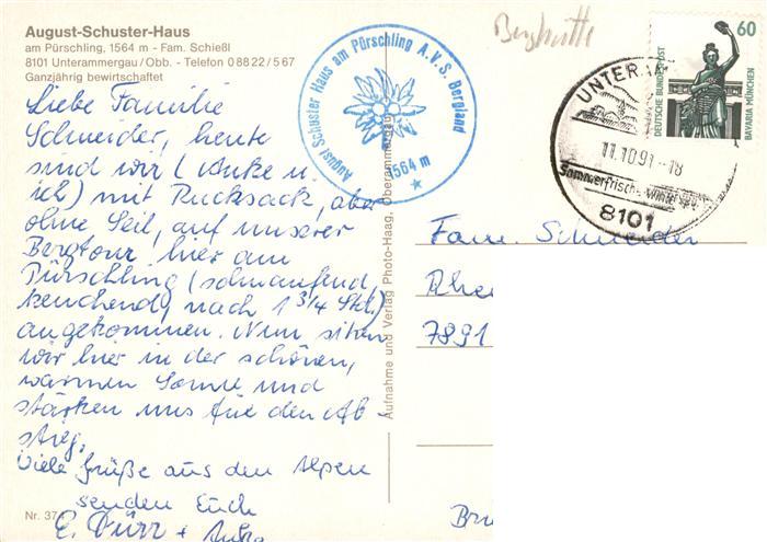 73932569 alte Postkarte Unterammergau August-Schuster-Haus Berghuette am Puerschling postalisch gelaufen Erhaltung siehe scans [FriedD77] KatCode: 11110009180135