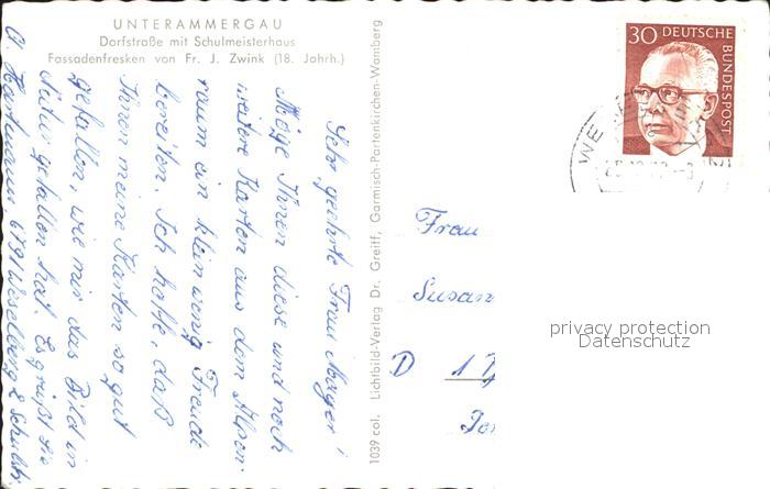 72090632 alte Postkarte Unterammergau Dorfstrasse mit Schulmeisterhaus Fassadenfresken J. Zwink 18. Jhdt. Kirche postalisch gelaufen Erhaltung siehe scans KatCode: 11110009180135