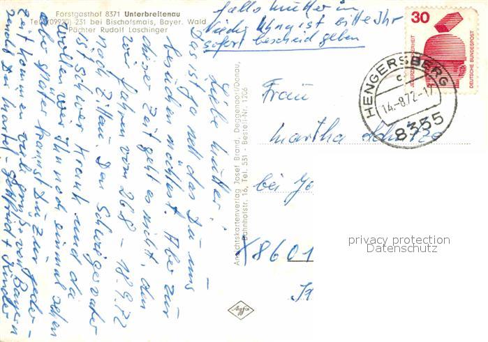 72819542 alte Postkarte Unterbreitenau Bischofsmais Forstgasthof Duerrwies Ferienhaus Teufelstisch postalisch gelaufen Erhaltung siehe scans [KathaD81] KatCode: 11110009276116