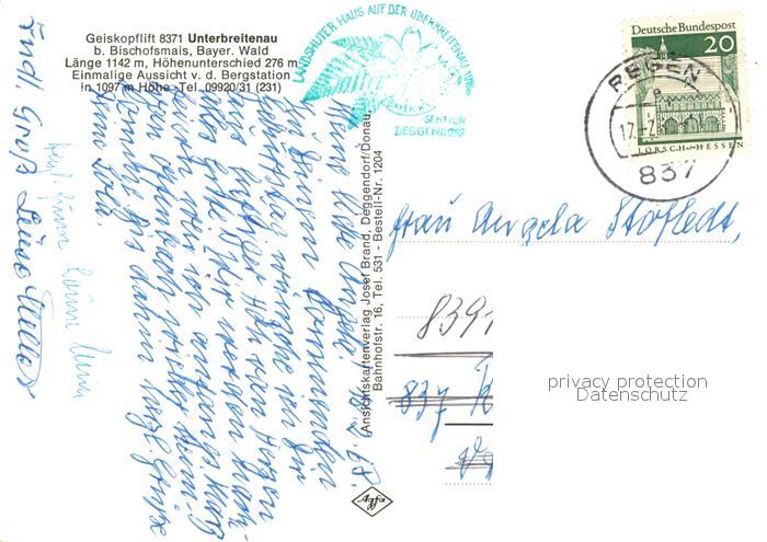 73163138 alte Postkarte Unterbreitenau Bischofsmais Geisskopflift Oberbreitenau Forstgasthof Forsthauslift postalisch gelaufen Erhaltung siehe scans [WerneD78] KatCode: 11110009276116