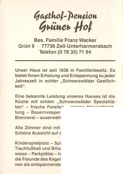 73930775 Unterharmersbach Gasthof Pension Gruener Hof postalisch nicht gelaufen Werbekarte (keine Postkarte) Erhaltung siehe scans [FriedD77] KatCode: 11110008317146