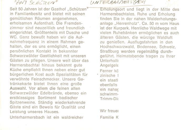 73937101 Unterharmersbach Gasthof Zum Schuetzen Gaststube postalisch nicht gelaufen Werbekarte (keine Postkarte) Erhaltung siehe scans [WerneD78] KatCode: 11110008317146