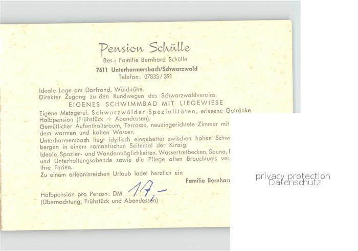 71941688 Unterharmersbach Pension Schuelle postalisch nicht gelaufen Werbekarte (keine Postkarte) Erhaltung siehe scans KatCode: 11110008317146