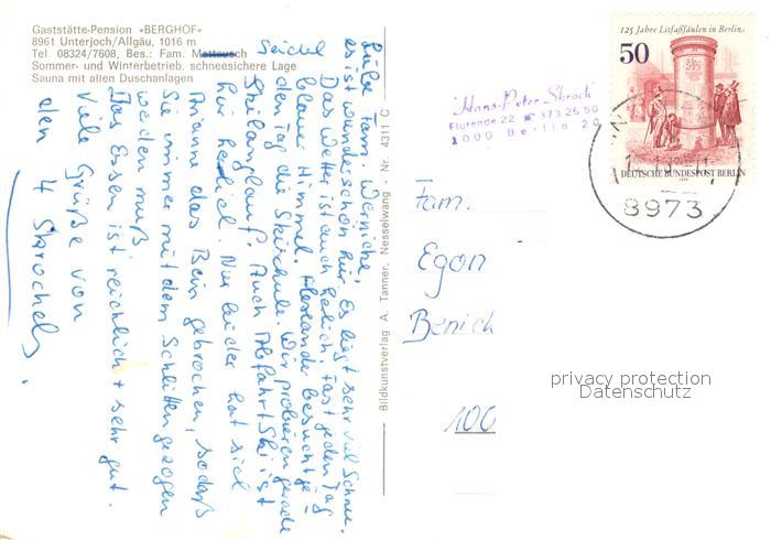 73645996 alte Postkarte Unterjoch Gaststaette Pension Berghof Allgaeuer Alpen postalisch gelaufen Erhaltung siehe scans [FriedD77] KatCode: 11110009780123