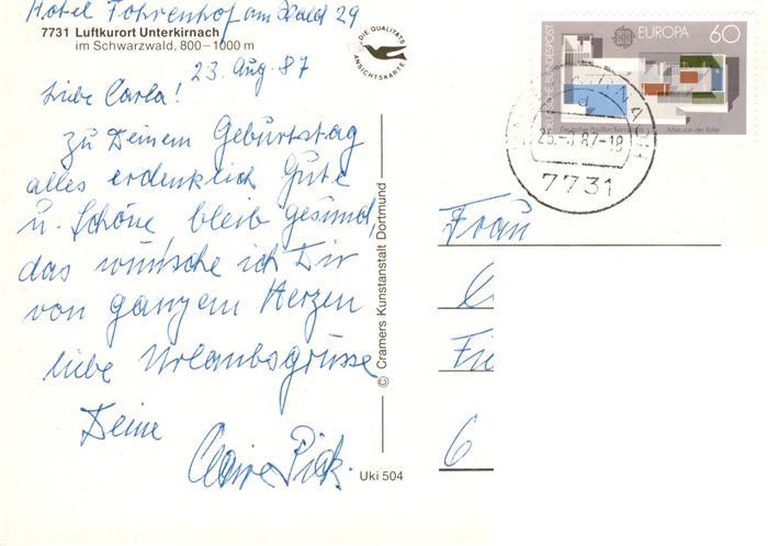 73888471 alte Postkarte Unterkirnach Panorama Natur und Vogelpark Schlossberg Minigolf Freilichtbuehne Wildgehege Salvest Drachenbrunnen postalisch gelaufen Erhaltung siehe scans [FriedD77] KatCode: 11110008326065