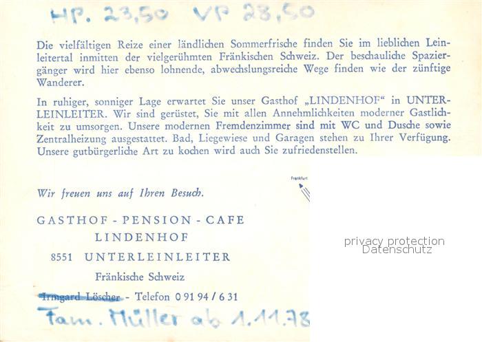73654466 Unterleinleiter Cafe Pension Lindenhof Gastraum Ortspanorama Landschaft postalisch nicht gelaufen Werbekarte (keine Postkarte) Erhaltung siehe scans [FriedD77] KatCode: 11110009474168