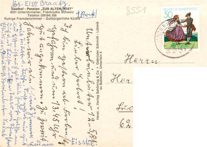 73932228 alte Postkarte Unterleinleiter Forchheim Bayern Gasthof Pension Zur Alten Post Gastraeume Panorama postalisch gelaufen Erhaltung siehe scans [WerneD78] KatCode: 11110009474168