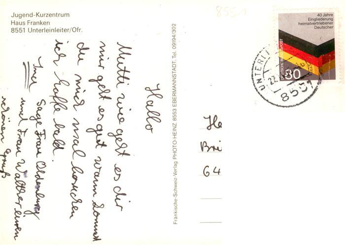 73932205 alte Postkarte Unterleinleiter Forchheim Bayern Jugend Kurzentrum Haus Franken Gastraum Hallenbad Gartenschach postalisch gelaufen Erhaltung siehe scans [WerneD78] KatCode: 11110009474168