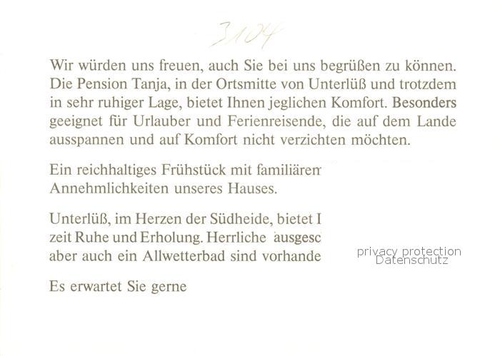 73086185 Unterluess Pension Tanja postalisch nicht gelaufen Werbekarte (keine Postkarte) Erhaltung siehe scans [KathaD81] KatCode: 11110003351020
