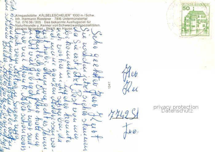 72677585 alte Postkarte Untermuenstertal Almgaststaette Kaelbelescheuer Ausflugsziel Schwarzwald Esel postalisch gelaufen Erhaltung siehe scans [FriedD77] KatCode: 11110008315130