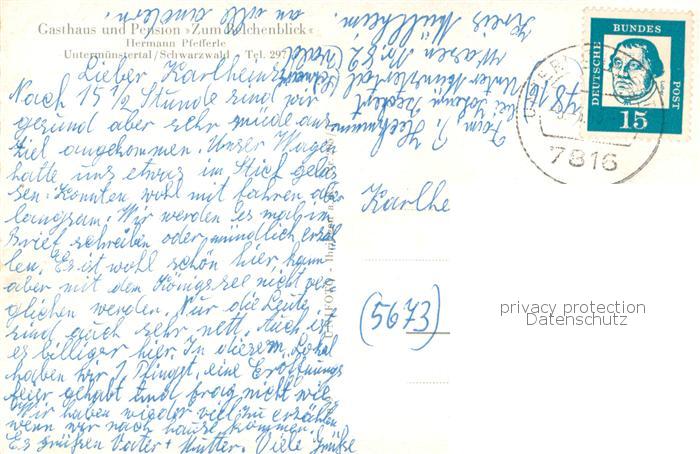 73775720 alte Postkarte Untermuenstertal Gasthaus Pension Zum Belchenblick Schwarzwald postalisch gelaufen Erhaltung siehe scans [FriedD77] KatCode: 11110008315130