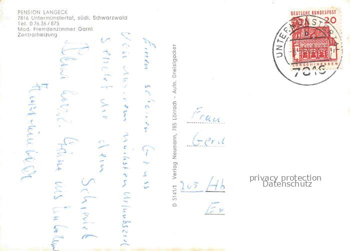 34145680 alte Postkarte Untermuenstertal Muenstertal BW Pension Langeck postalisch gelaufen Erhaltung siehe scans [WerneD78] KatCode: 11110008315130