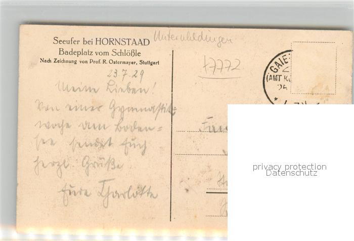 43291011 alte Postkarte Unteruhldingen Seeufer Hornstaad Badeplatz vom Schloessle Zeichnung Ostermayer postalisch gelaufen Erhaltung siehe scans [KathaD81] KatCode: 11110008435066